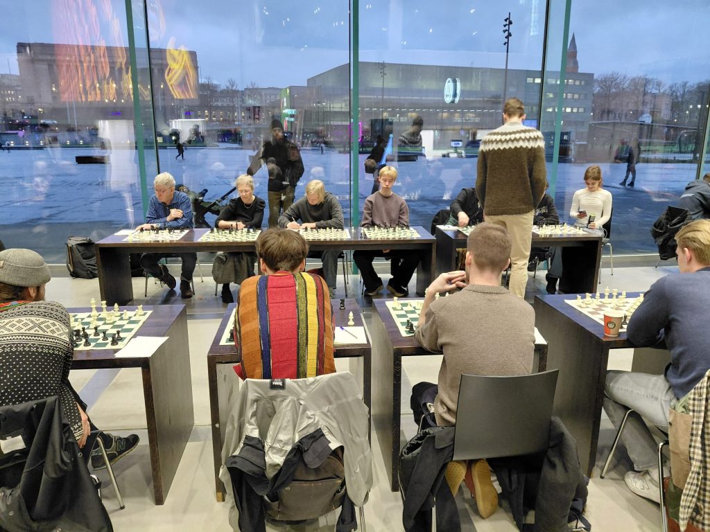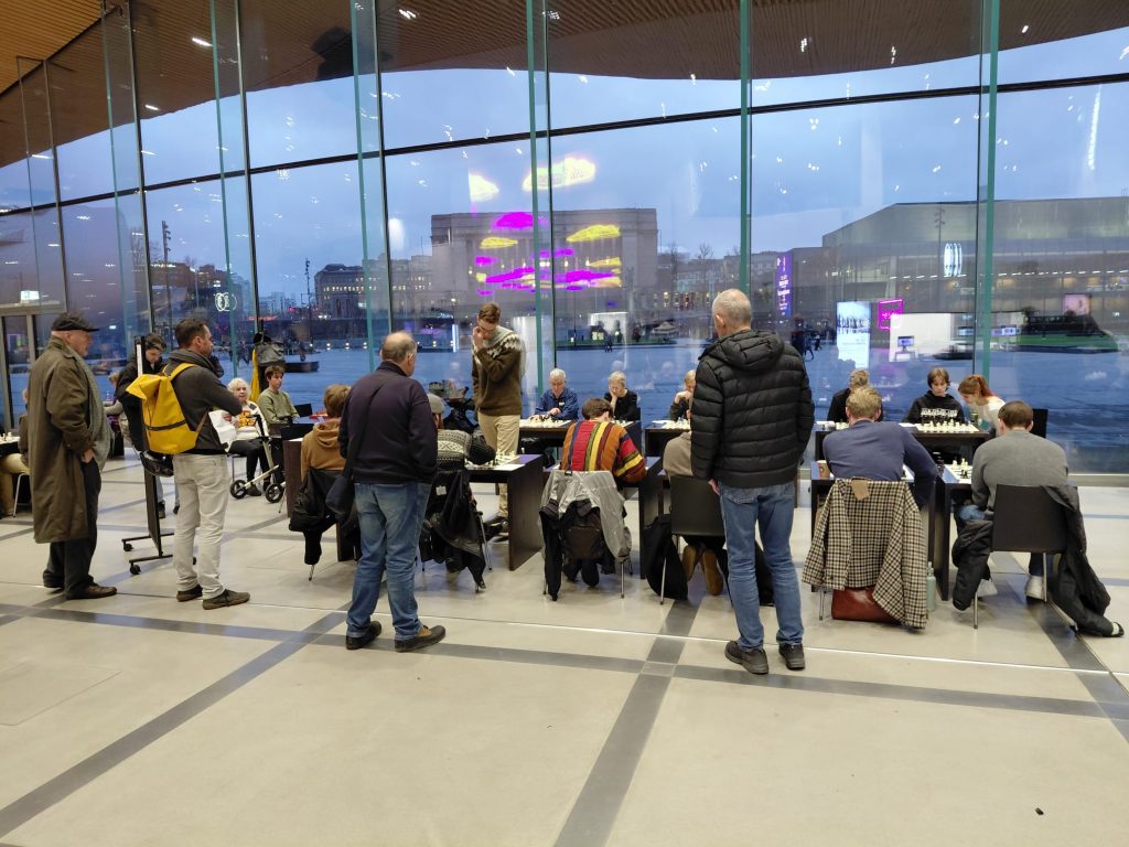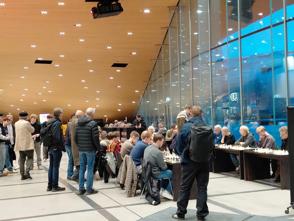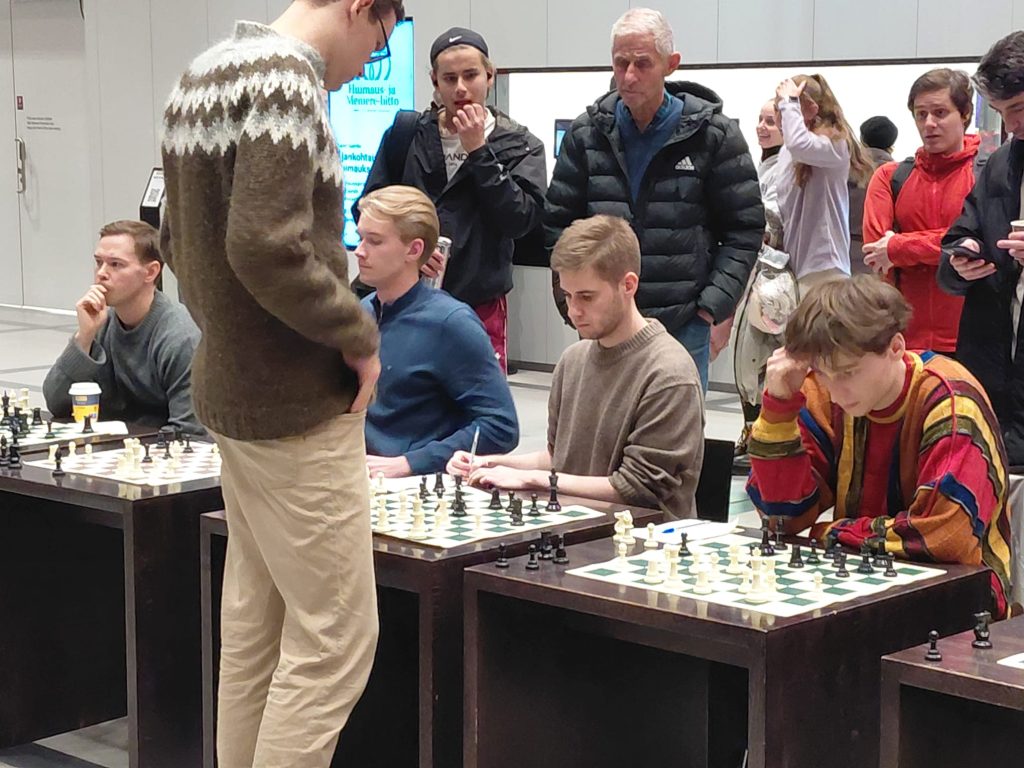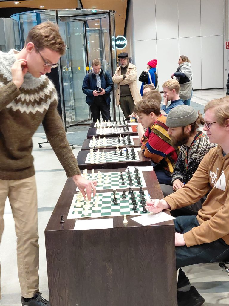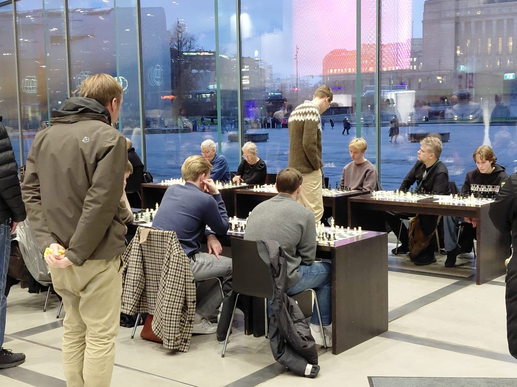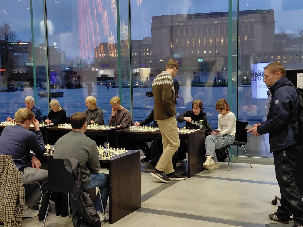 Shakkimestari Kim Kåhre antoi simultaanin keskuskirjasto Oodissa 5.10. Risto Peltola kuvasi.